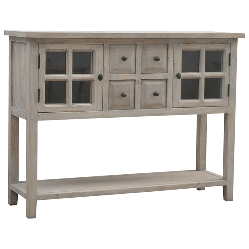 This console table would fit perfectly in any kitchen. It comes with 4 drawers and 2 glazed door cabinets with shelves inside providing useful storage space for your plates and cutlery. It is constructed from 100% solid mango wood which is meticulously hot dipped using a laborious caustic wash technique. This lengthy multi-stage finishing process gives a beautiful weathered and aged acid washed finish. Some other features include straight feet, round knob handles to the drawers, an under shelf and cabinets which are made from brass.