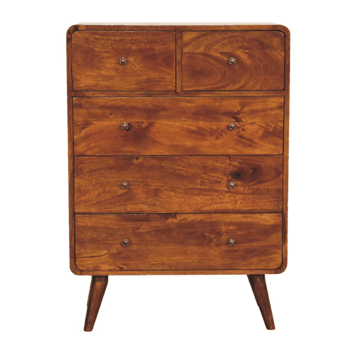 To match the other products from the curved collection, this 2 over 3 chest of drawers has been constructed from 100% solid mango wood in a rich chestnut finish and stands on 4 Nordic style legs. It features shiny accent knobs on each drawer providing easy access when storing any clothes, towels, duvets, etc. The curved design provides smooth, safe corners and gives the product a modern and contemporary look which is perfect for city homes and apartments.