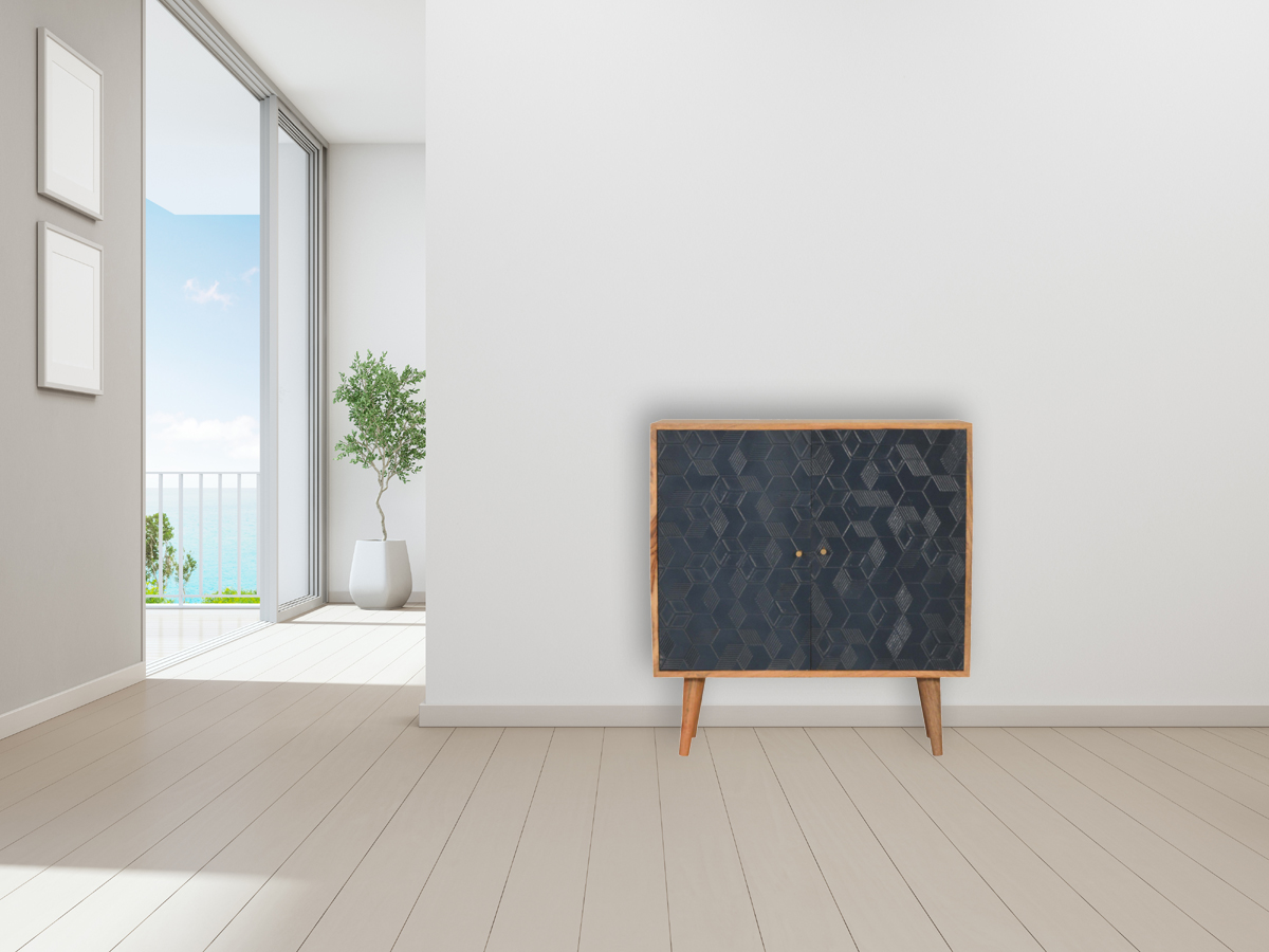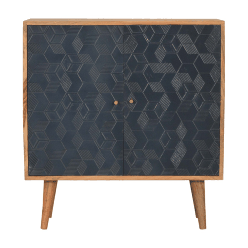 This stunning piece has been constructed from 100% solid mango wood and features nordic style legs. It provides useful storage space and is finished with shiny brass knobs. The Navy cube design is partnered nicely with the finish of the wood giving an overall modern and chic look.