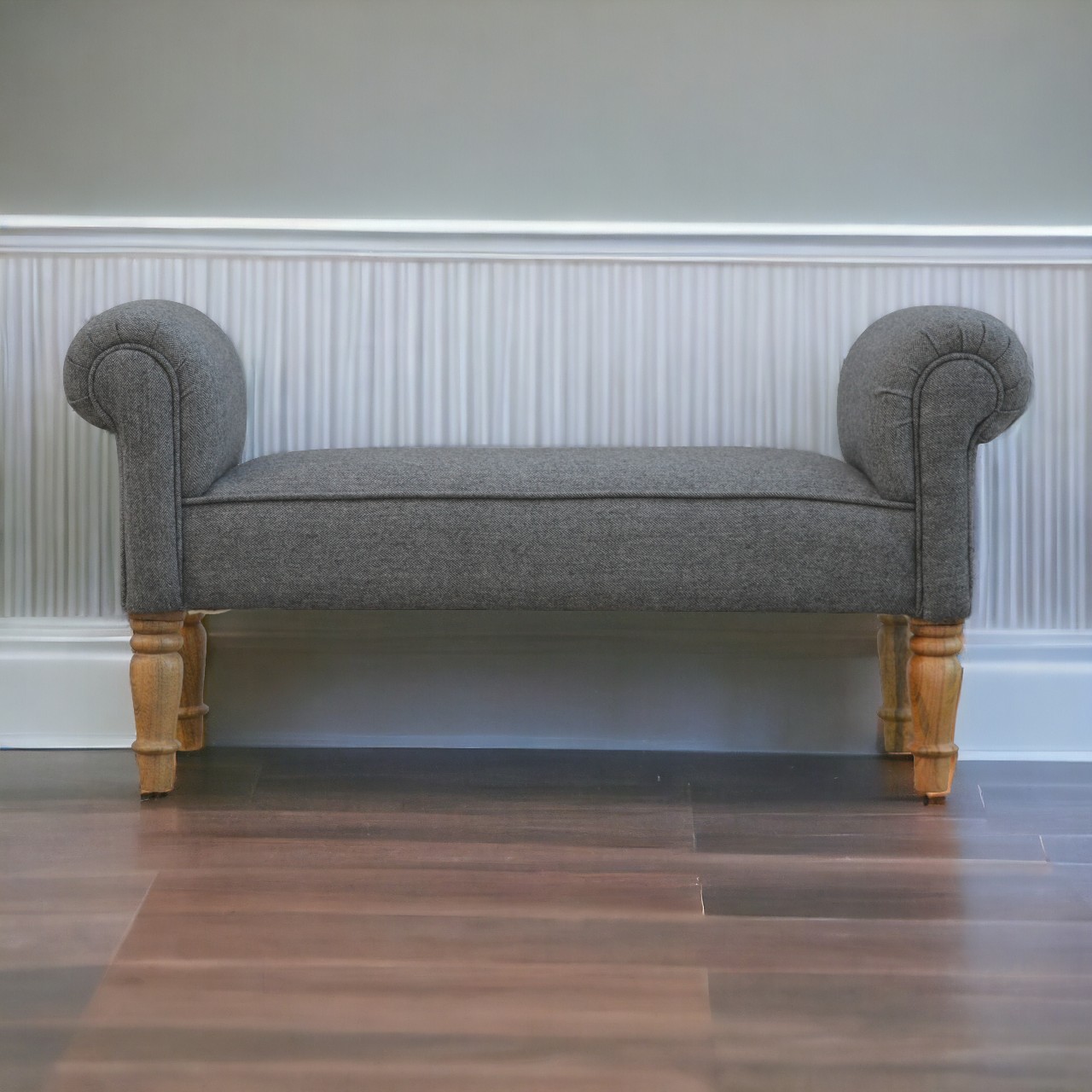 Update your interior with this lovely black tweed bench, perfect for a bedroom or any living area in your home, this multi-functional bench is ideal for extra seating. This bench features turned legs made of 100% solid mango wood. A perfect piece of furniture ideal for a hallway, end of the bed, or simply standalone living room furniture.