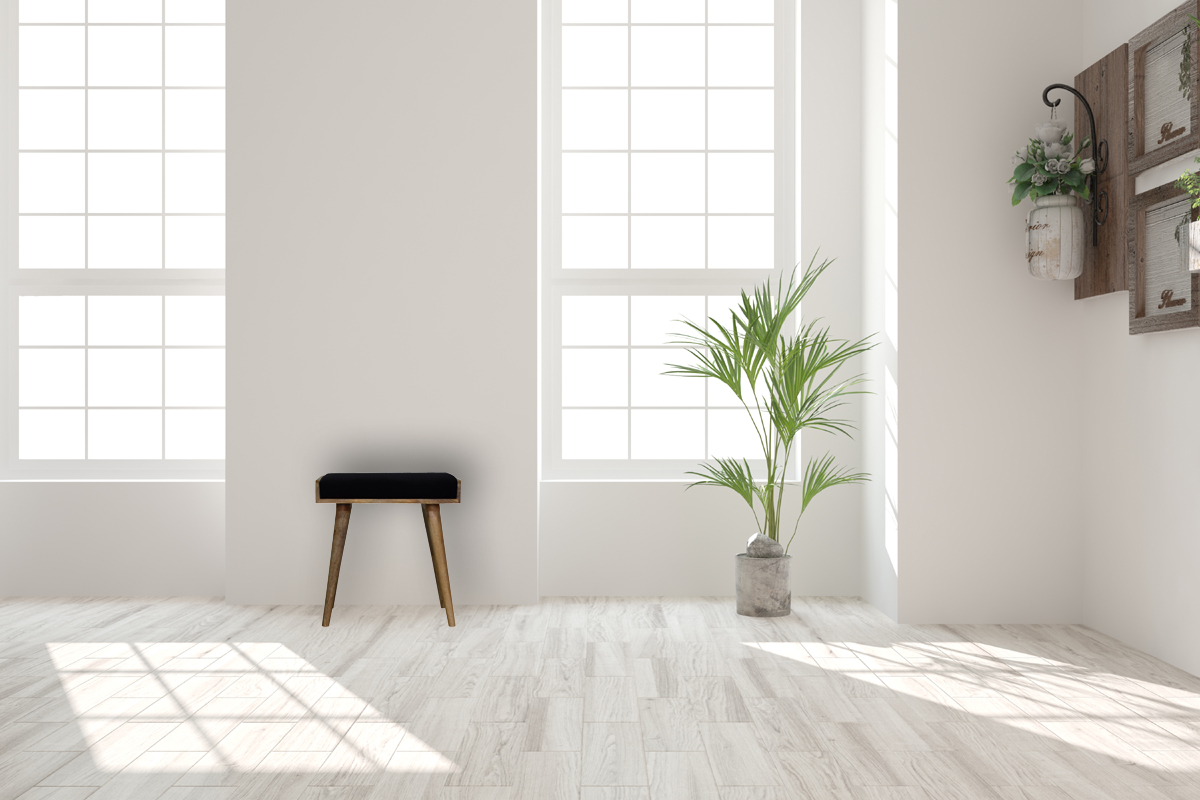 This footstool features a tray-style design and 4 Nordic-style legs in an oak-ish finish. It has an upholstered black cotton velvet, which works as a comfortable seat and can be incorporated into many different interior styles as it offers a very simple, clean, and modern design, along with providing a nice contrast between the material and wood.