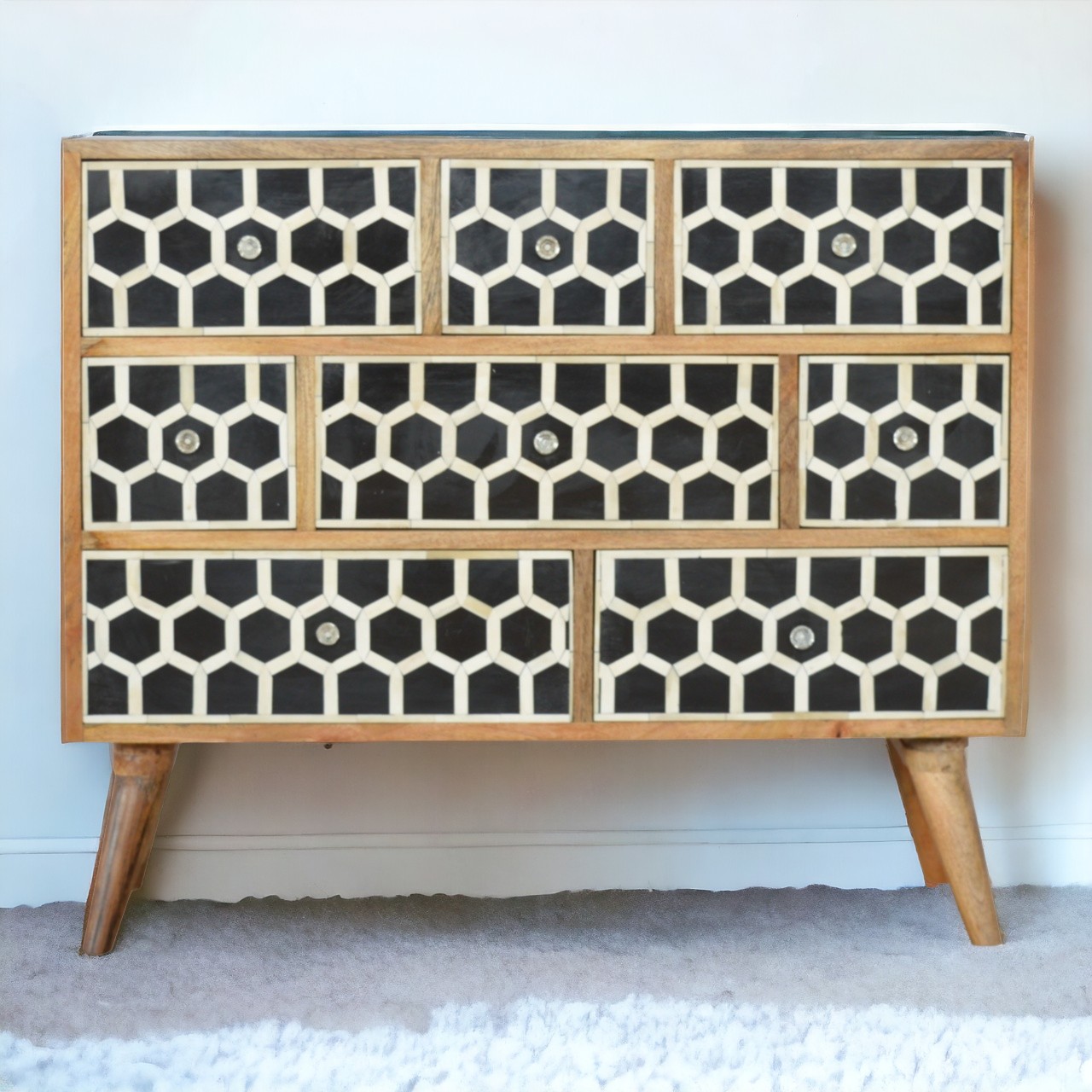 This 8 drawer chest is the perfect piece for any bedroom. It is an essential piece of everyday household furniture giving you space to store clothing as well as providing a surface for all your bits and pieces. It features bone inlay drawer fronts with glass knobs and is made from 100% solid mango wood in a fine oak-ish finish with Nordic style legs. The bone inlay is sourced responsibly from deceased animals such as camels, goats, and buffaloes.