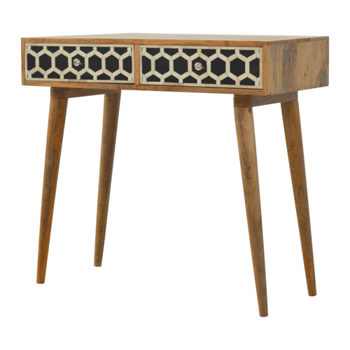 Simple, elegant, country-style charm is what this practical console table will provide. Constructed from 100% solid mango wood in a Oak ish finish, this unit has been built with sustainably sourced timbers and has two drawers with bone inlay fronts to help you keep your home organized. The bone inlay is sourced responsibly from deceased animals such as camels, goats, and buffaloes.
