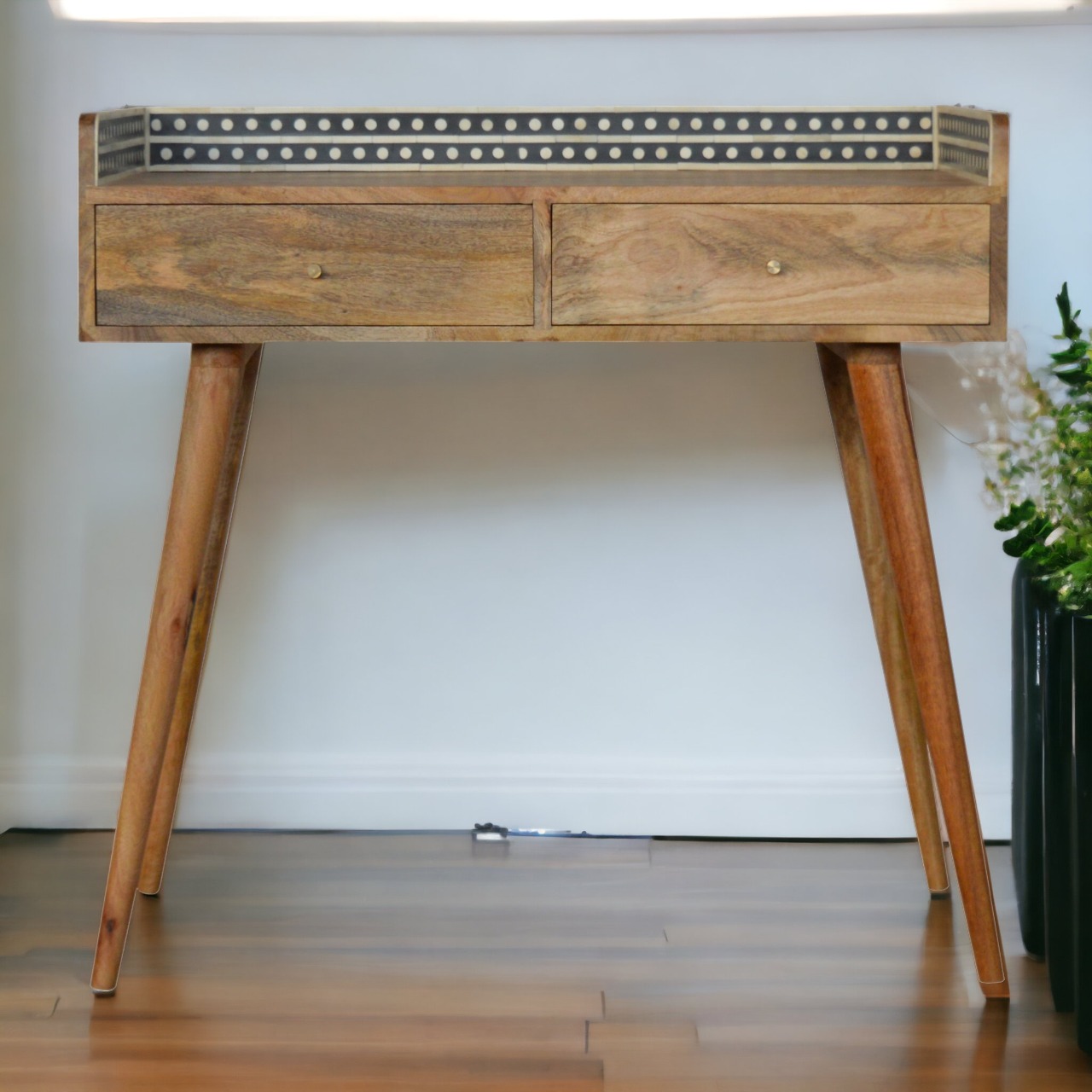 This solid wood console table has been constructed from 100% solid mango wood in an oak-ish finish, this piece features a charming bone inlay gallery back design that complements the grain and finish of the wood, it has cylindrical knobs for the drawers and stands on 4 Nordic style legs. The ideal piece for your hallway or living room. The bone inlay is sourced responsibly from deceased animals such as camels, goats, and buffaloes.