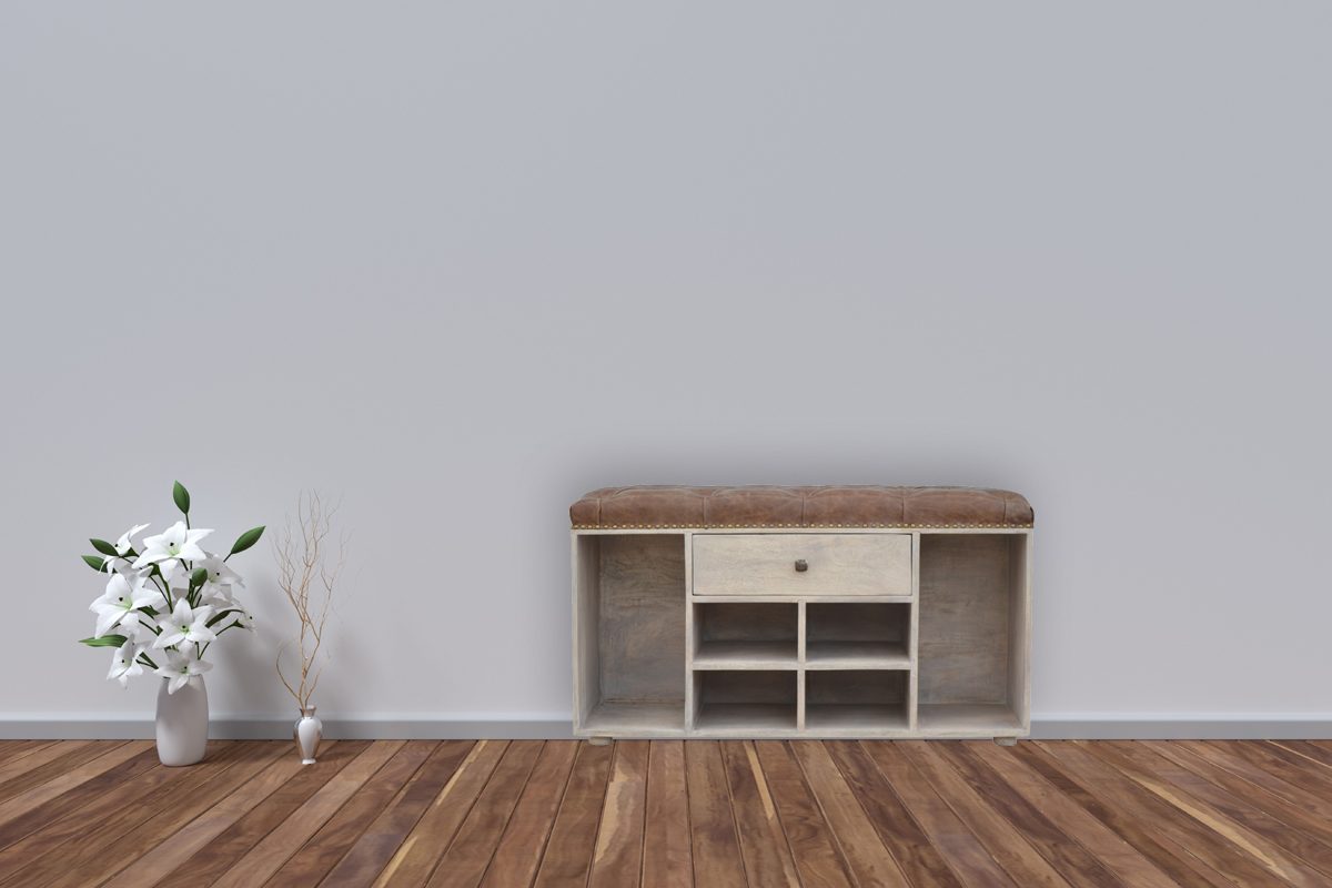 Petite, practical and extremely useful. You’ll love this open shoe storage unit as you walk past your hallway. This shoe cabinet is an amazing piece of furniture with slots for shoes as well as boots. The upholstered buttoned top seat gives it a comfy feel to sit & relax on the move. It is constructed from 100% solid mango wood and the top is upholstered in multi tweed. Other features include 4 bun feet which have a fine oak-ish finish and 1 drawer that comes with a shiny knob handle. A must have for every home.