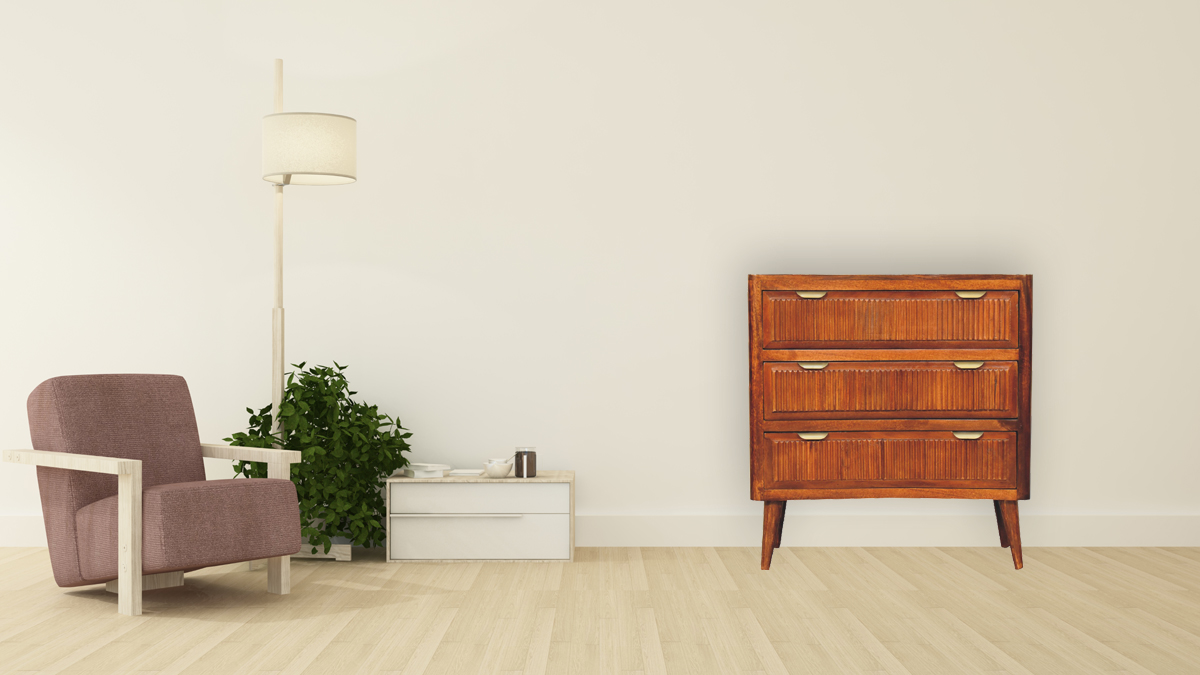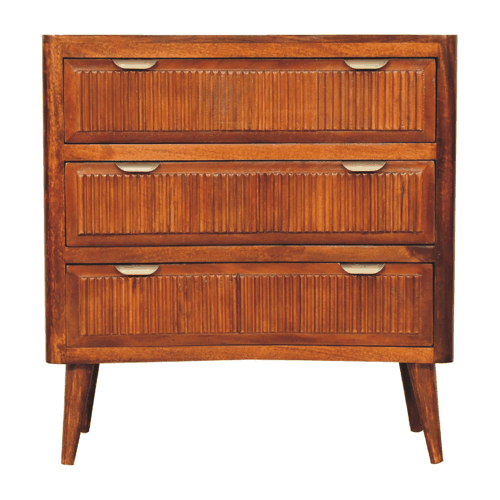 Create a focal point in the bedroom or guest room with our striking Capri Chest. It is constructed from 100% mango wood with a chestnut finish and has a ridged pattern on the drawer fronts. Other features include nordic style legs and brass handles. A matching bedside is available for a co-ordinated look in your home.