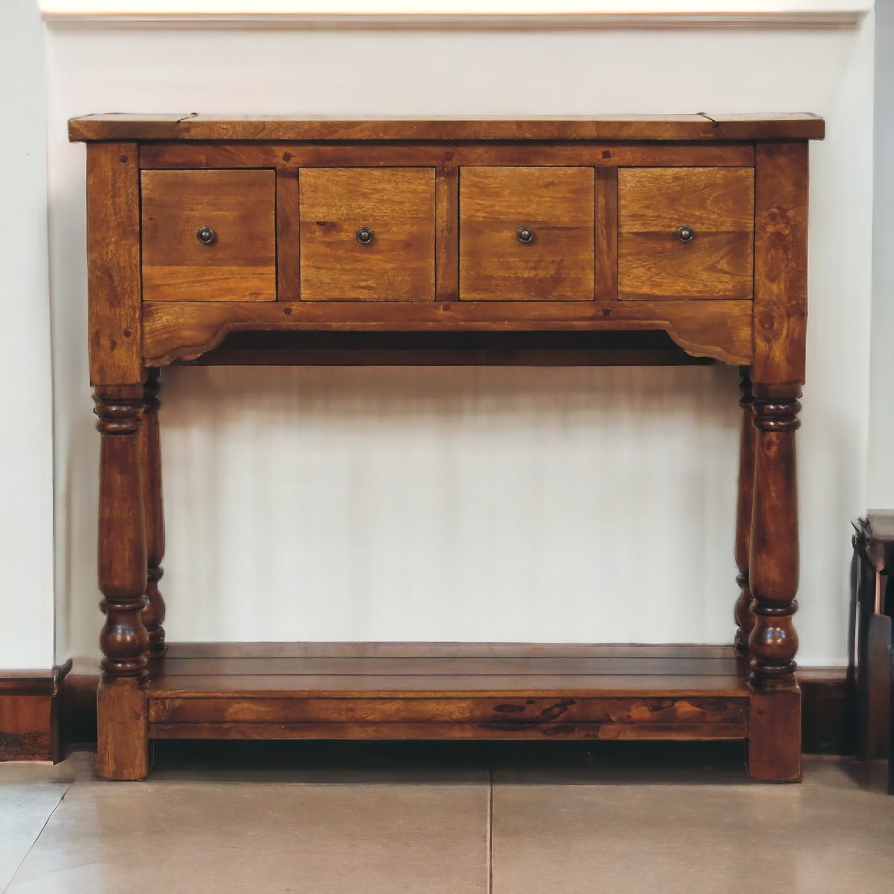 The perfect piece of furniture for any living space is this narrow console table, which is constructed from 100% solid mango wood and has a chestnut finish. It has features such as hand-turned legs, four drawers that come with shiny handles, and a lower shelf for extra storage.