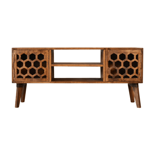 Want to add a stunning contemporary vibe to your home, look no further than the Chestnut Comb Media Unit it has been constructed from 100% solid mango wood in a chestnut finish it features 2 open carved door fronts as well as 2 large open slots perfect for storage convenience and 4 nordic style legs. A great statement piece for the living room