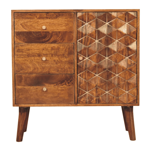 This cabinet is endlessly versatile and will prove handy all over your home. It has been constructed from 100% solid mango wood and has a beautiful chestnut finish with a cubed carved design on the door fronts. It also features shiny knobs and has 4 Scandinavian-styled legs.