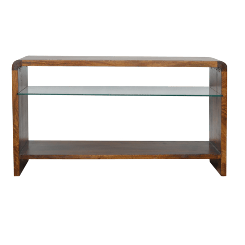 This media unit has a simple classic character, constructed from 100% solid mango wood in a chestnut finish, it features a glass shelf which can be used for placing books, magazines or anything you wish to store in the living room and making it convenient to use when you need it, use it alone or pair this media unit with the rest of the collection.