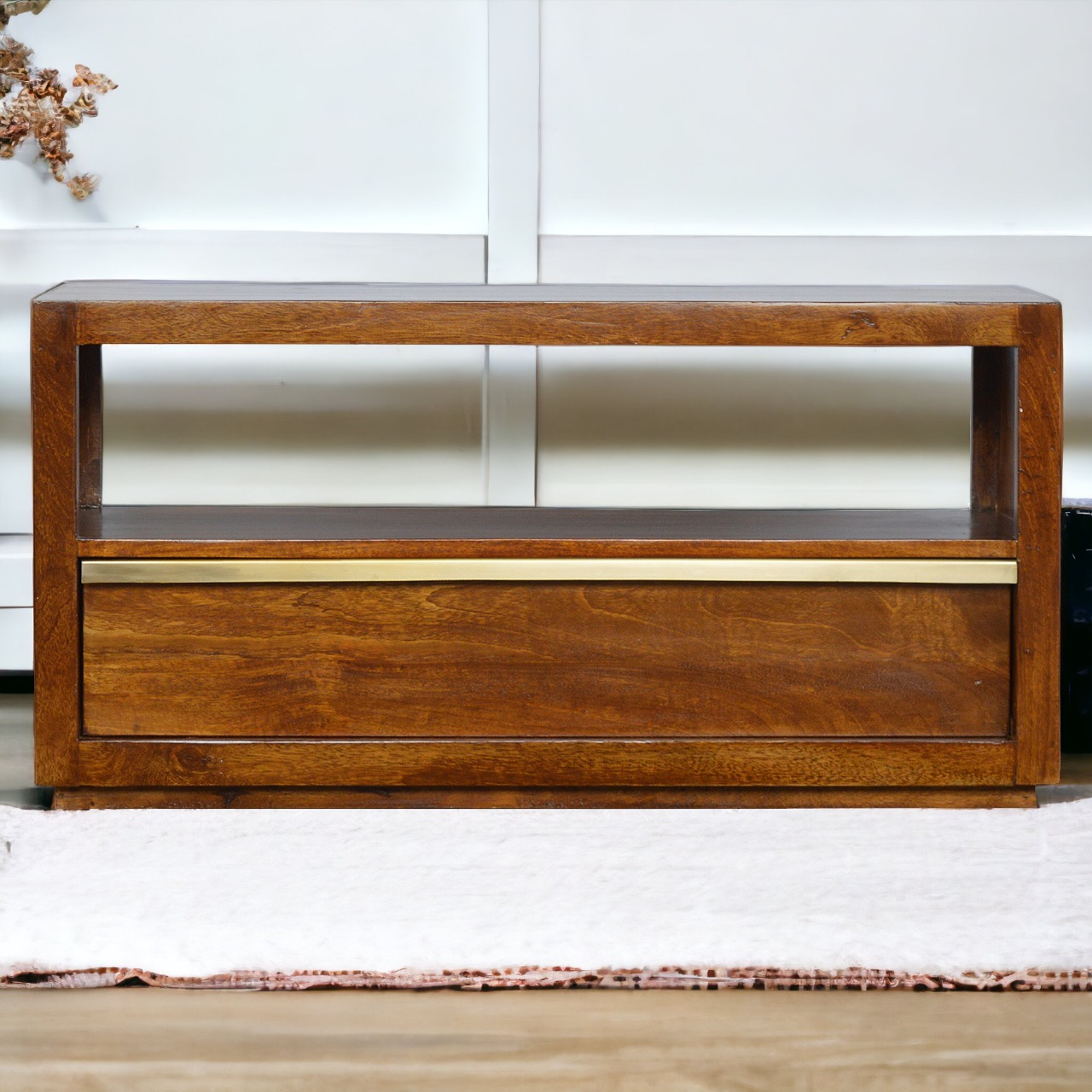 Add this media unit to your home, featuring a clean-cut design with an open slot and 1 pull-out drawer with a golden bar handle. The piece can stand alone beautifully or be partnered with the other pieces from the range. It has been constructed from 100% solid mango wood and has been finished in a rich light chestnut colour giving the piece a nice contrast between the gold metal and wood. It has ample space for a TV, any ornaments, or photo frames. The perfect addition to modern homes and compact city apartments.