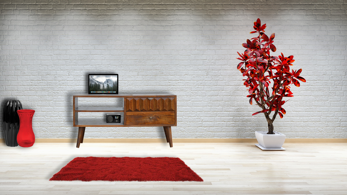 Add this unique solid wood media unit to your living room, constructed from 100% solid mango wood in a chestnut finish, this piece features 2 open slots and 2 drawers wherein 1 has a raised hand-carved prism shape on the drawer front. It features 4 Nordic-style legs which complement the body nicely and gives the entire piece a contemporary look. The perfect addition to the home.