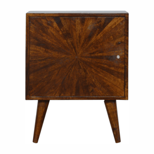 Showcasing the sunrise patterned door, this bedside table has been constructed from 100% solid mango wood in a chestnut finish and small shiny knobs. Offering a modern retro aesthetic, this bedside is a timeless option for your bedroom.