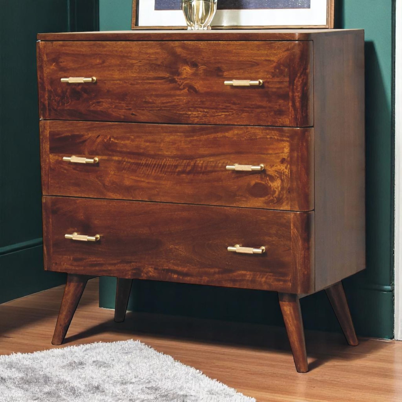 Introducing our Chestnut T-Bar Nordic Chest, this eye-catching chest is crafted from 100% solid mango wood with a chestnut finish. Its features include 3 spacious drawers, Nordic-style legs, and 6 shiny gold t-bar handles. It’s the ultimate blend of style and functionality. Elevate your bedroom with this essential and elegant piece and conveniently use it to store your clothes.
