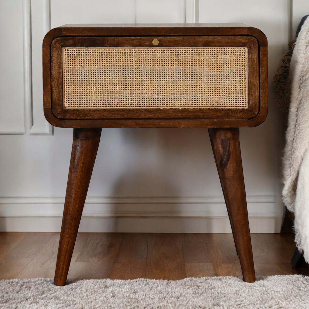 This stylish Nordic Woven bedside combines a woven drawer front with a smooth chestnut finish body and legs. Constructed from 100% solid mango legs it has a shiny knob on the drawer and nordic style legs. Make full use of this bedside in the bedroom and partner it with the rest of the collection.
