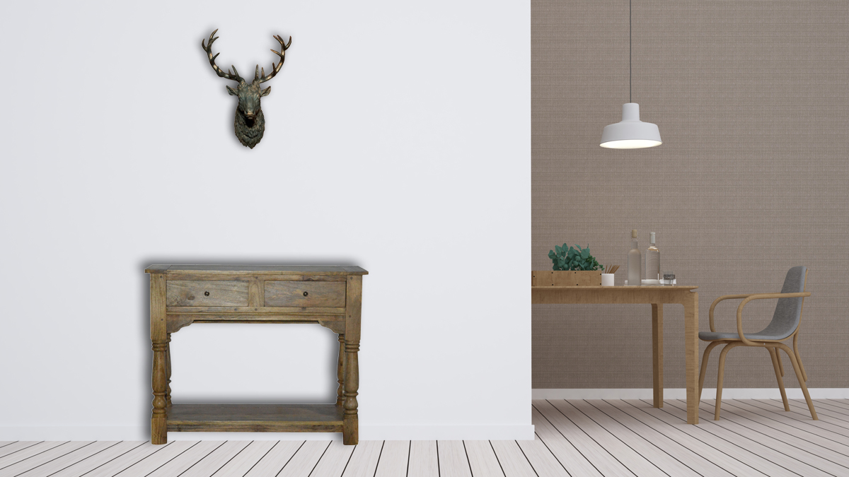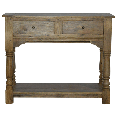 Simple, elegant, is what this practical hallway country style console table will provide. This 100% solid mango wood unit has been built with sustainably sourced timbers and has two drawers to help you keep your home organized and storing any little household objects. Other features include 4 hand turned legs, knobs; shelf at the base and this console table has a fine oak-ish finish.