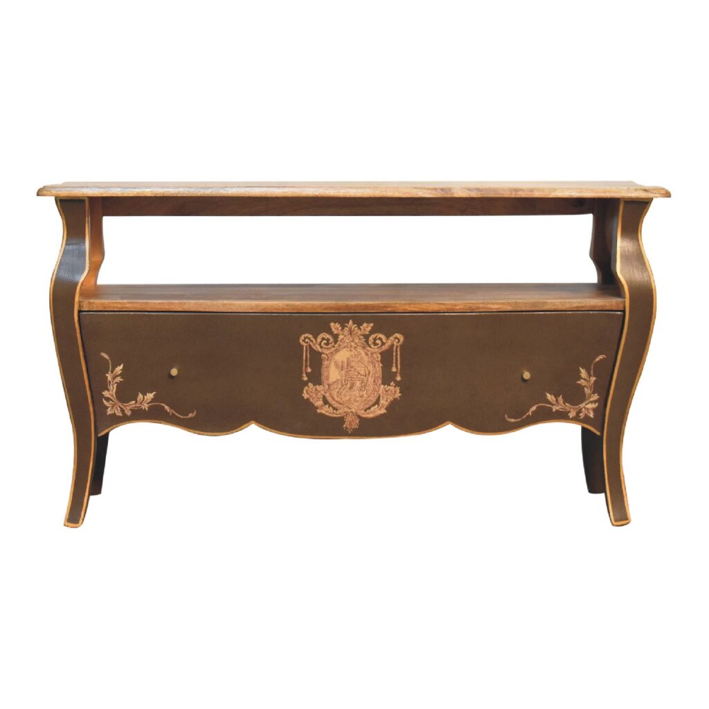 Discover elegance with the Coroner Collection Bedside Table, a French-style masterpiece in a unique greyish-green finish with a natural top and inside the drawers. Made from solid mango wood, this bedside table features a hand-painted, sketched crown crest design, adding a royal touch to your bedroom. The design is complemented by sophisticated Chantilly legs and shiny brass knobs, blending functionality with luxury. Ideal for those who cherish a blend of elegance, durability, and historical charm in their home decor, this piece is destined to become a family heirloom.