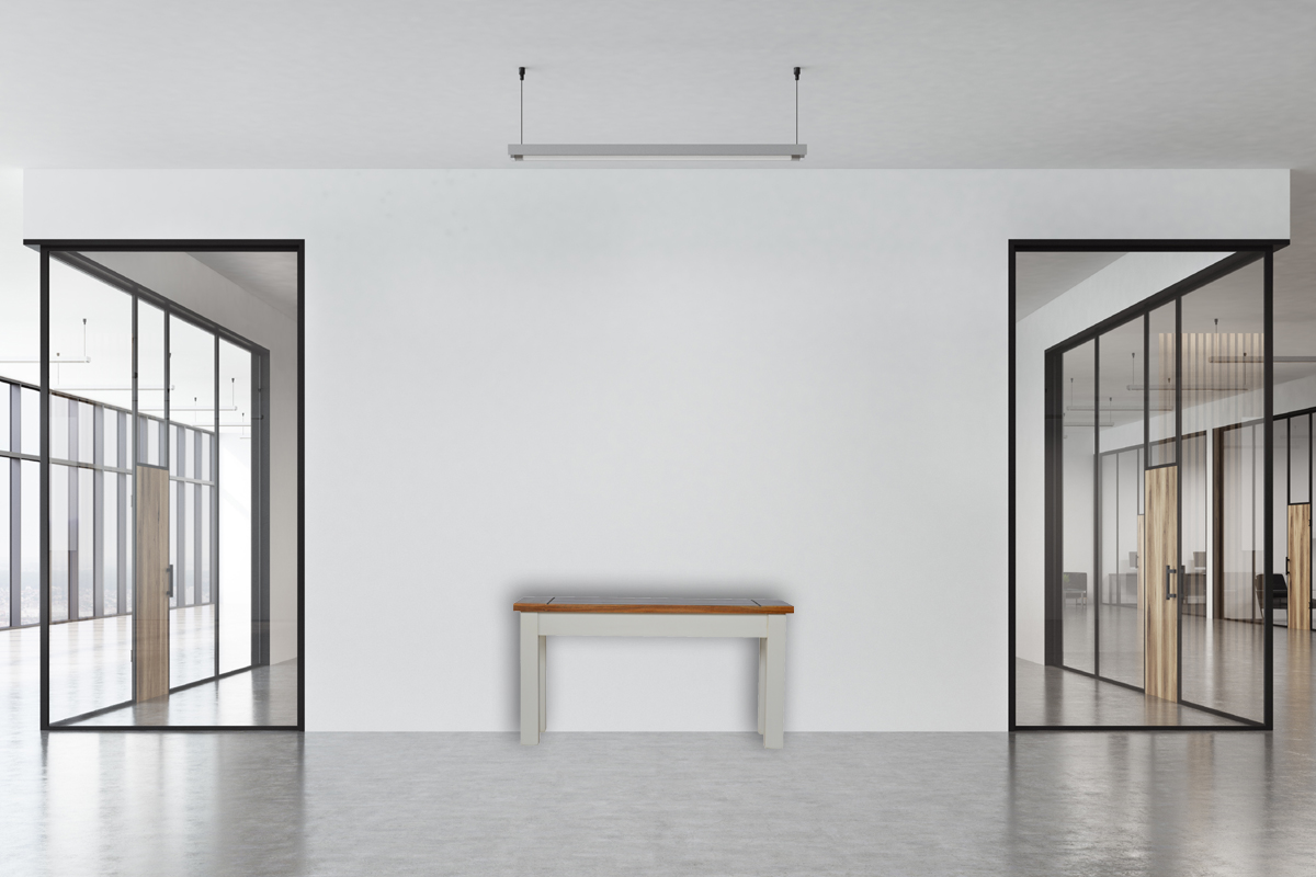 This hallway bench has a white hand spray painted base which is constructed from solid mango wood and a rich honey finish top which is constructed from solid acacia wood. Other features include 4 straight farm house legs.