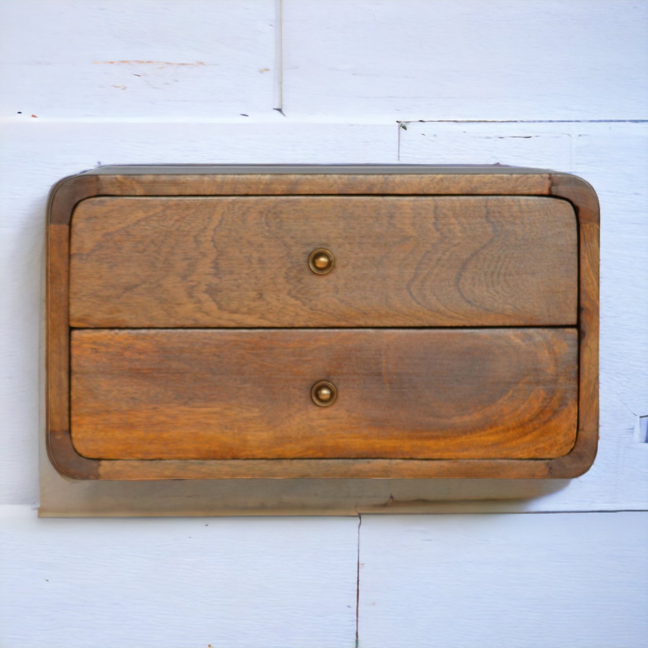 Inspired by our curved range, this minimalistic wall-mounted unit has been constructed from 100% solid mango wood in a chestnut finish and features 2 drawers that feature shiny knobs. This piece is perfect for storing any bits and pieces you wish to keep close by before bedtime. Its neat and clean design can easily be mounted on the wall without the fuss of any legs. Caution! Do not sit on the unit.
