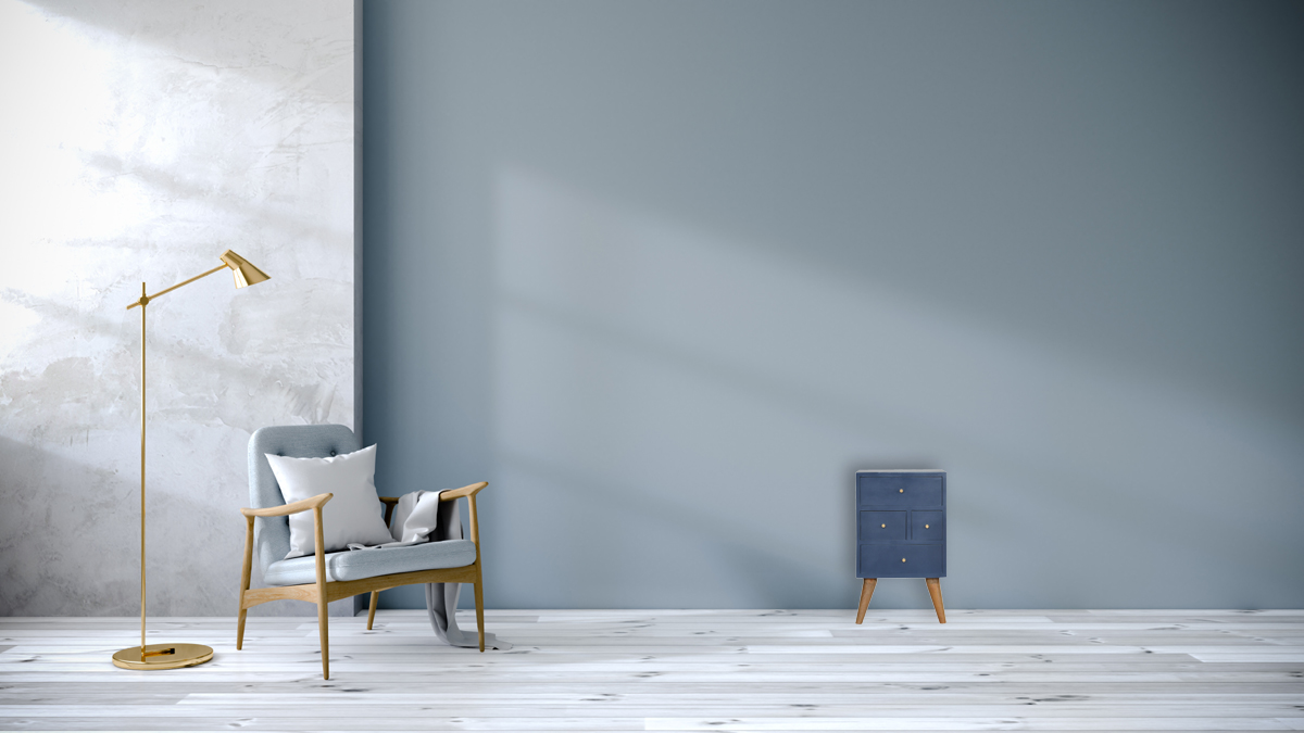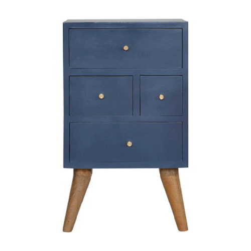 This multi-drawer bedside has a beautiful unique design that will catch a lot of attention in the bedroom. Constructed from 100% solid mango wood it has been hand-painted in a dark blue colour with 4 oak-ish finish legs and shiny knobs on the drawers. Perfect for storage and convenience, this bedside will make a great addition to the bedroom.