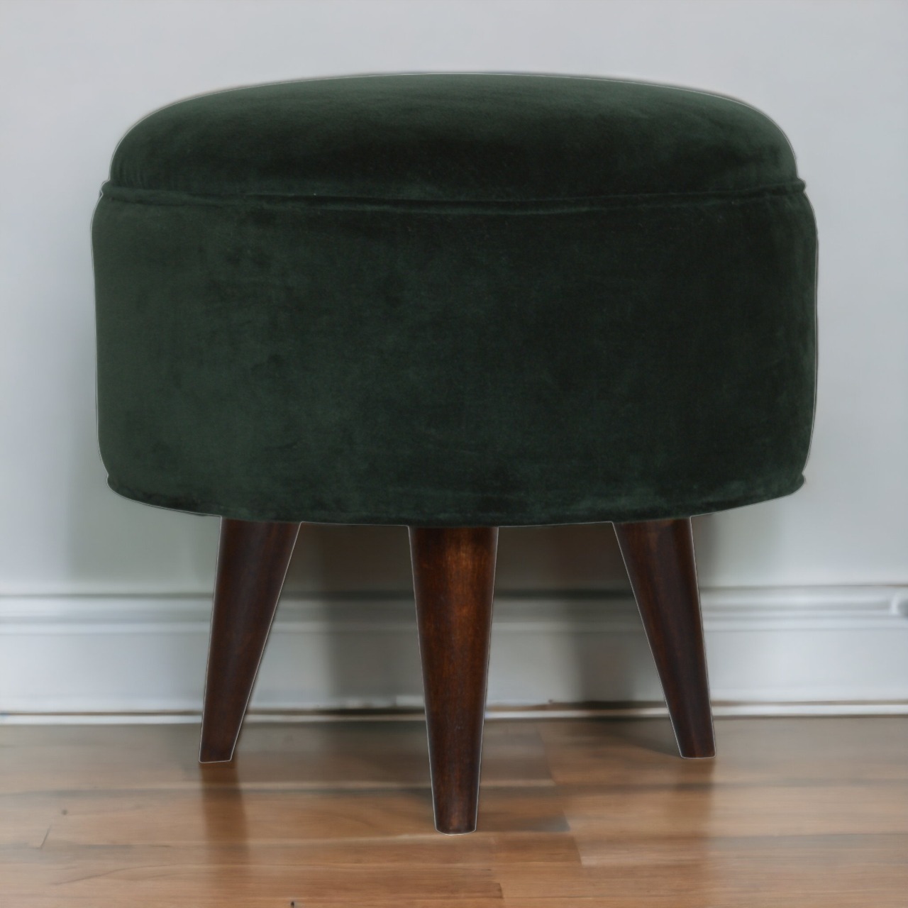 This beautiful footstool provides the perfect contrast between the beautiful upholstered emerald green cotton velvet and wooden legs constructed from 100% solid mango wood in walnut finish, made to compliment the classic Nordic style. Making a perfect footrest, handbag stand, or accent piece for the corner of the bedroom, hallway, or living space, this little stool will add a pop of colour to any room and serve handy all over the home.