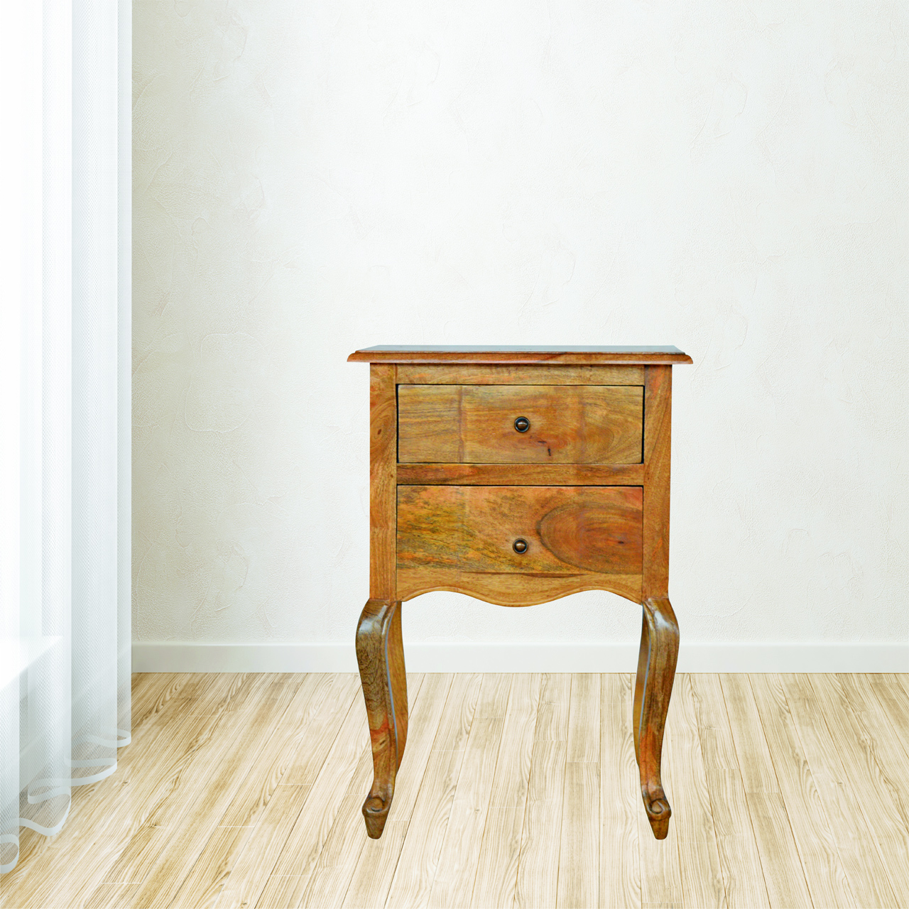 This bedside has been constructed from 100% solid mango wood in an oak-ish finish with 2 shiny knobs and is an elegant addition to any bedroom. It features 2 drawers for storage space and an ample surface area for all your decorative furnishings. Delicate hand carved designs feature scrolls and scallops that flow beautifully with the subtle curves of the chest and cabriolet style legs. Every piece of furniture is individually handcrafted and includes swing care tickets explaining the cautions and aftercare instructions.