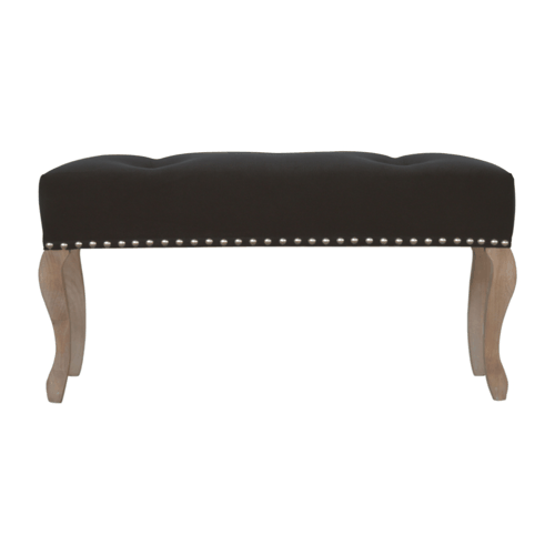 This elegant bench has been upholstered in a black cotton velvet fabric. It features carved French style legs constructed from 100% solid mango wood providing strength and durability along with a deep button and studded design. This simple yet classy piece can be incorporated in different home settings and interiors.