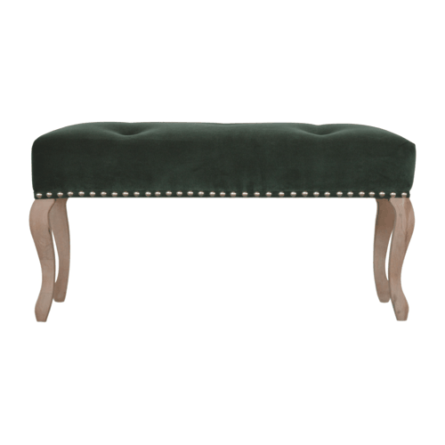This elegant bench has been upholstered in a emerald green cotton velvet fabric. It features carved French style legs constructed from 100% solid mango wood providing strength and durability along with a deep button and studded design. This simple yet classy piece can be incorporated in different home settings and interiors.