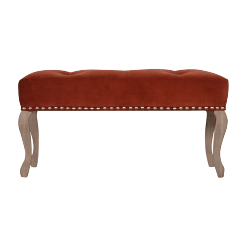 This elegant bench has been upholstered in a rust cotton velvet fabric. It features carved French style legs constructed from 100% solid mango wood providing strength and durability along with a deep button and studded design. This simple yet classy piece can be incorporated in different home settings and interiors.