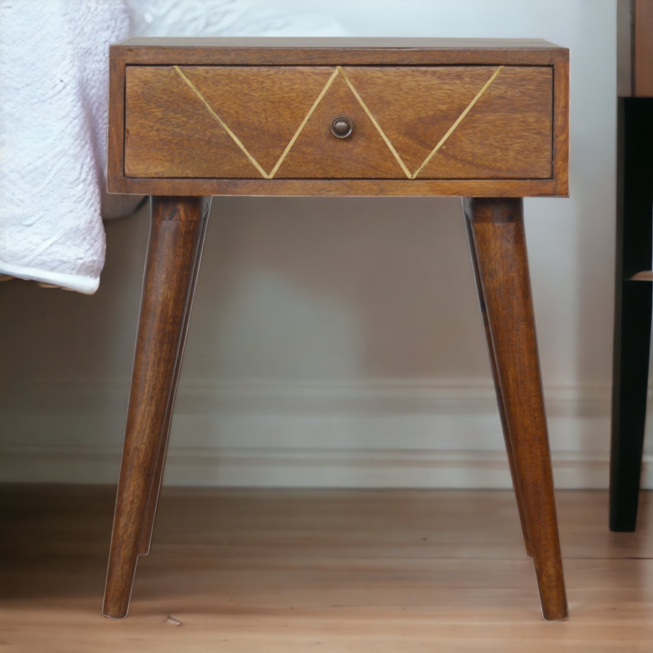 This bedside is endlessly versatile and will prove handy all over your home. It has been constructed from 100% solid mango wood and has a beautiful chestnut finish with wired brass inlay on the drawer front. It also features 1 shiny knob and 4 Scandinavian style legs.