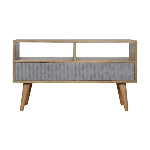 Add this lovely media unit to your living room. It features a beautiful hand carved design on the drawer front and has been constructed from 100% solid mango wood in an oak-ish finish with grey hand painted drawer fronts. It offers 2 open slots which will come in handy when storing or displaying any bits.