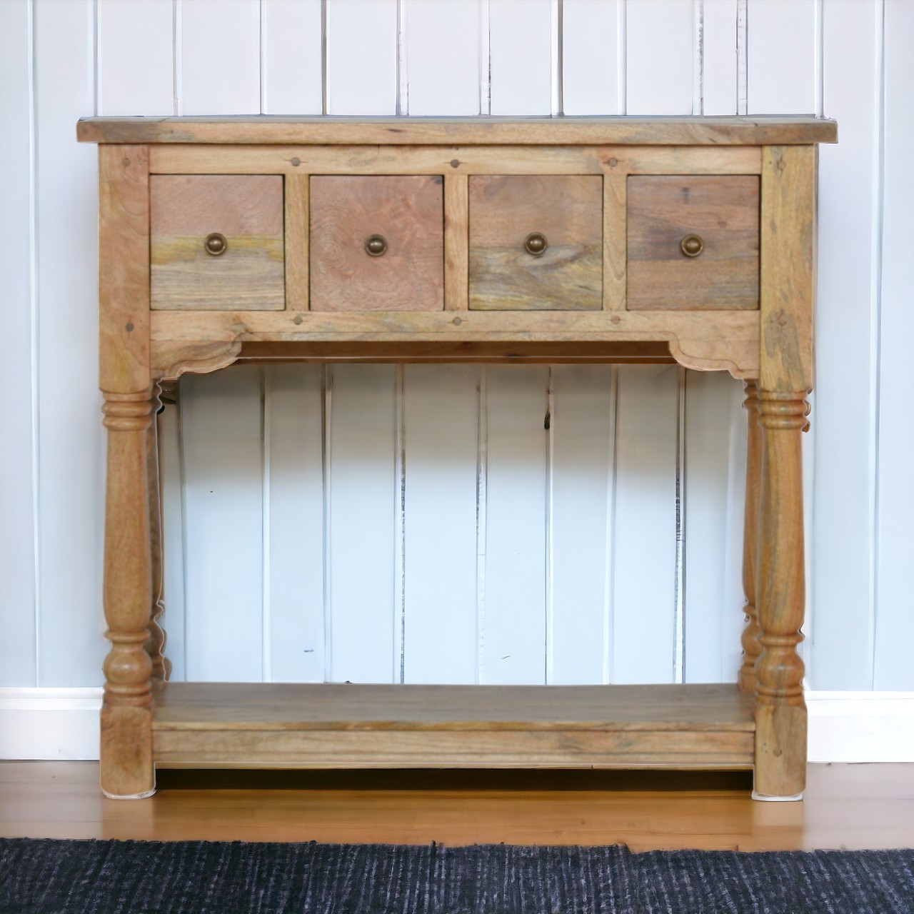 The perfect piece of furniture for any living space is this narrow console table, which is constructed from 100% solid mango wood and is hand distressed with an oak-ish finish. It has features such as hand-turned legs, four drawers that come with shiny handles, and a lower shelf for extra storage.