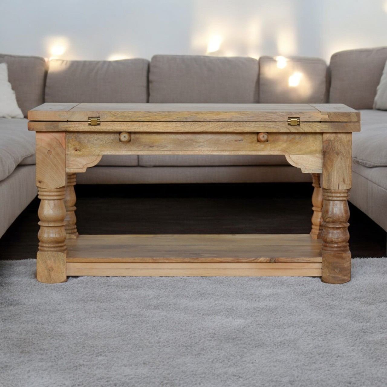 A traditional coffee table with under shelf and extending top. The solid wood Extending Coffee Table has an appealing rusticity, country and solid design with its hand distressed oak-ish finish and hand-turned legs. Made from 100% solid mango wood, this has been built to last and offers plenty of storage with an under-shelf. It can also easily be extended with a butterfly mechanism allowing an extra 47cm of space when needed.