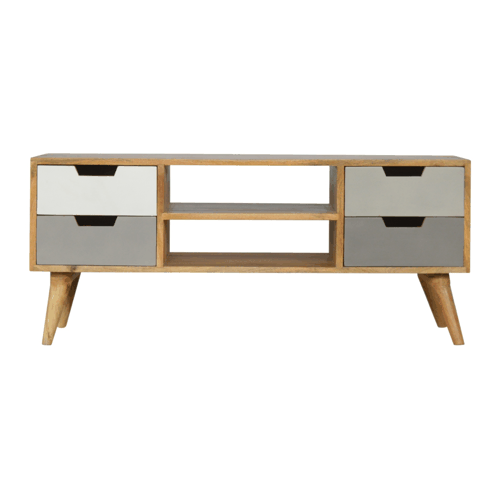 This Nordic gradient style media unit will bring a whole new look to your home, with its simple yet modern and beautiful design this piece is constructed from 100% solid mango wood and has a fine smooth oak-ish finish. It has useful storage with 4 spacious drawers that are individually hand painted with 2 tones of grey and 2 shelves for displaying any bits you wish to show off in the home. Some other features include 4 Nordic style legs and cut handles for the drawers. Every piece of furniture is individually handcrafted and includes swing care tickets explaining the cautions and aftercare instructions.
