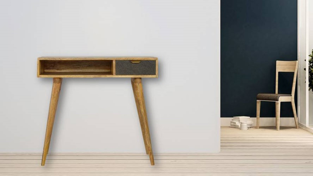 This writing desk has been finished with a fabric front drawer upholstered in a grey tweed to match perfectly with the fabric front bedside table, this writing desk takes a different twist on furniture by incorporating 2 materials and combining them together. It features a solid wood body finished in an oak-ish finish and a golden pull-out handle with 4 Nordic style legs. It is the perfect addition to both modern and country homes and also open slot which is perfect for studying and keeping any papers, notes or stationary.