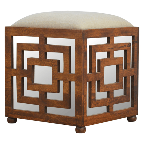 Add this foot stool to your hallway, bedroom or conservatory. Constructed from 100% solid mango wood with a beautiful carving on the sides and upholstered in a cream linen seat pad for seating provding comfortability. It is the perfect addition for a home which is versatile and can be incoorporated with other furniture products.