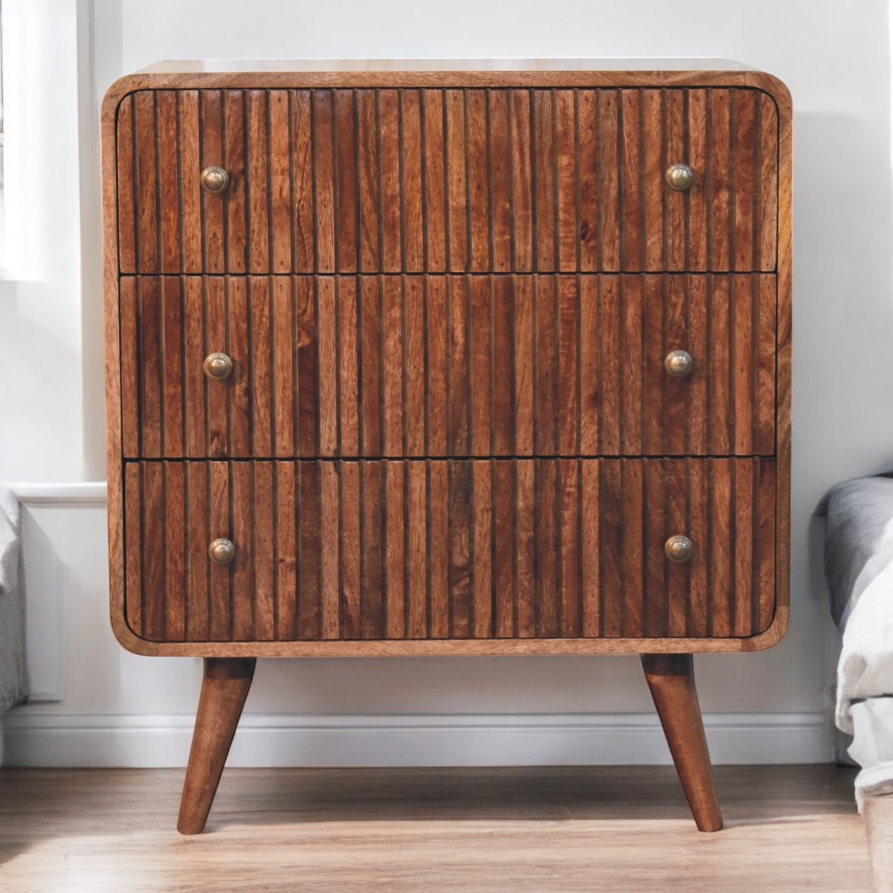 This beautiful T-bar Ridged Chest has been constructed from 100% solid mango wood and has a lovely natural honey caramel finish. It has features such as t-bar handles for easy access to the drawers, as well as 4 Nordic style legs for stability and a modern touch. Make full use of this piece in your bedroom and let it take care of storing all your belongings.