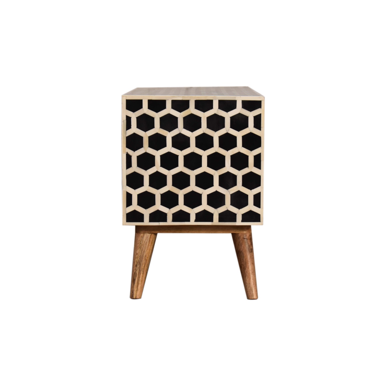 This media unit has a clean and simple design to suit most homes. This piece has a lovely oak-ish finish and features 2 bone inlay drawer fronts which have a honeycomb pattern and 2 glass knobs. It provides 2 open slots and 2 drawers for extra storage. Some other features 4 Scandinavian style legs.