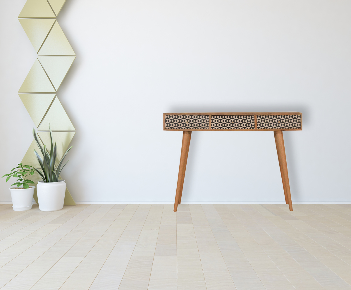 As part of our Rafina range, this console table has been constructed from 100% solid mango wood in an oak-ish finish. It has 3 drawers for storage convenience and features nordic style legs with shiny knobs which give a lovely contrast against the print. More items are available from the Rafina range.