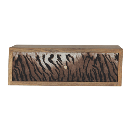 Introducing Animal Print. This wall-mounted bedside will take your bedroom to another level. Constructed from 100% solid mango wood in a fine oak-ish finish, the main feature being the drawer has a beautiful tiger animal print drawer finished with a shiny knob giving the whole piece extra character.