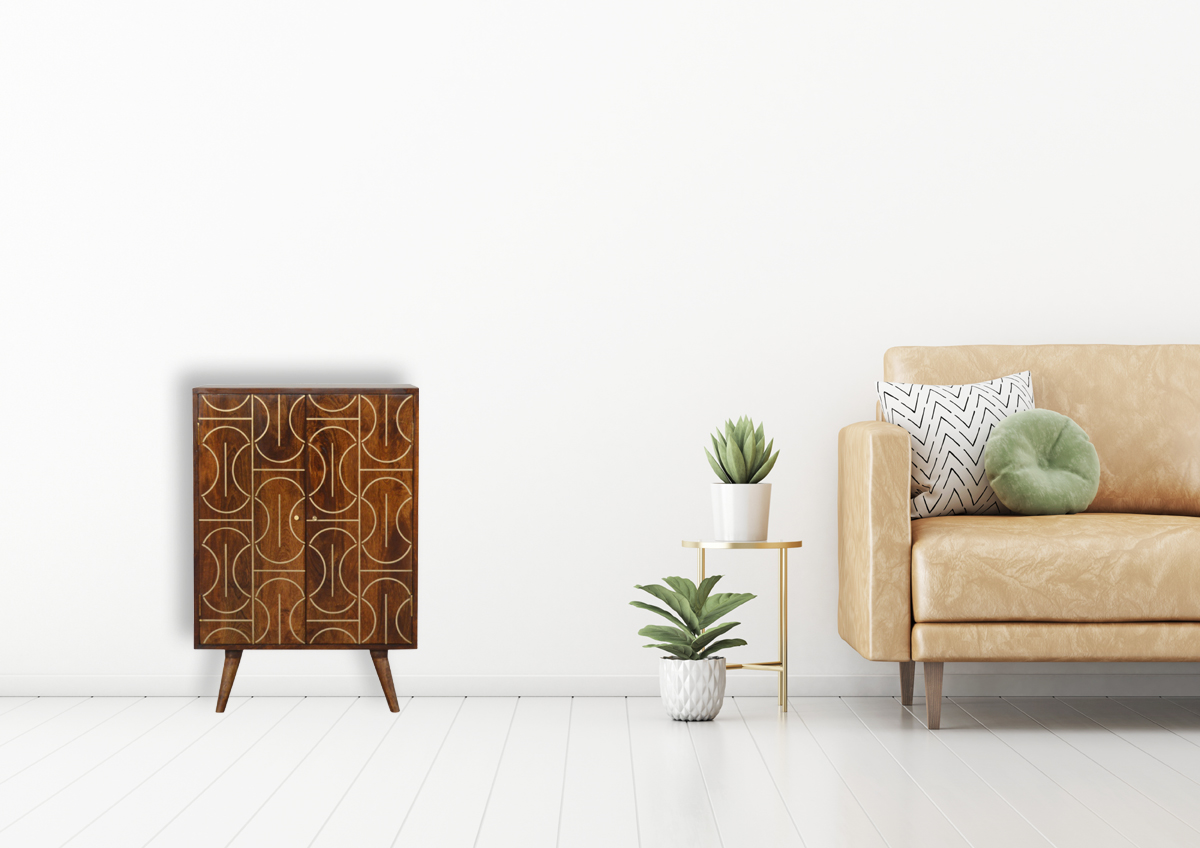 Constructed from 100% solid mango wood in a fine chestnut finish and offering storage space this cabinet will make the perfect piece for your home. It features a abstract brass inlay pattern on the door fronts and stands on 4 Nordic style legs. A gorgeous addition to the home.