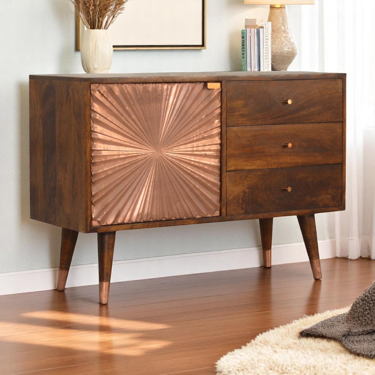 This Manila Copper Chestnut Sideboard was designed to add a touch of elegance and charm to your home. It features a copper-inlay plated cabinet and 3 drawers along with Nordic-style cap feet, it has been constructed from 100% solid mango wood and offers a rich chestnut finish, other features include pull-out handles along with surface space on top to uplift your living room or hallway.