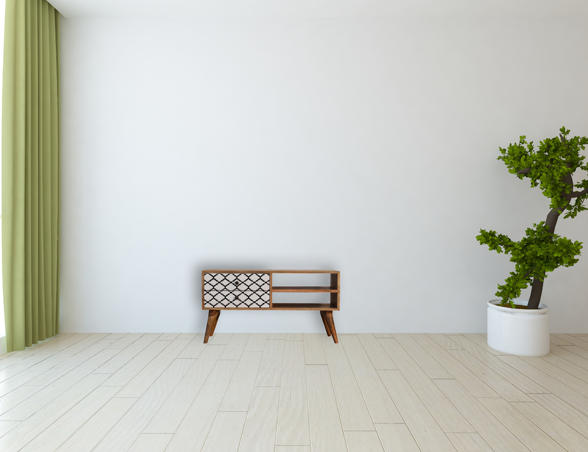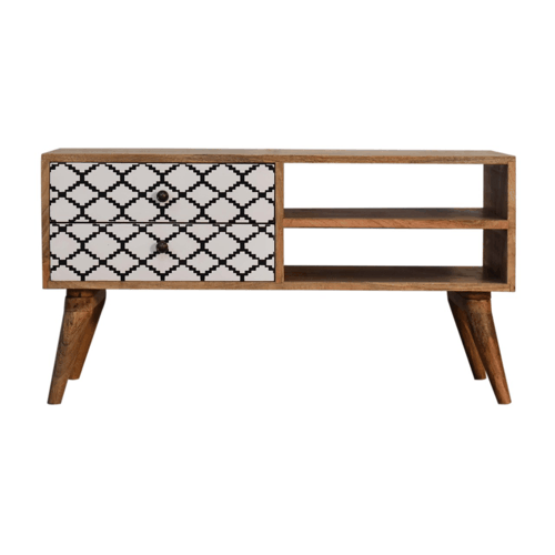 This 2 drawer media unit has been constructed from 100% solid mango wood and finished in a fine oak-ish finish body. The main feature of this piece are the patterned screen printed drawer fronts which have a beautiful black and white design giving the piece extra dimension and character. It also has 4 Nordic-style legs and ample space on top for a TV.