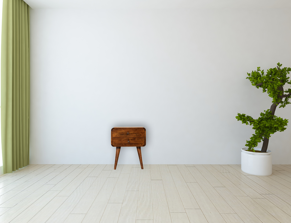 Endlessly versatile, this bedside table makes a perfect stand for nibbles, drinks, or a lamp. It is made from 100% solid mango wood in a fine chestnut finish and has nordic style legs. It has curved edges which will fit into any home/living space. Cable access is provided which allows you to plug in any electronic device with no fuss.