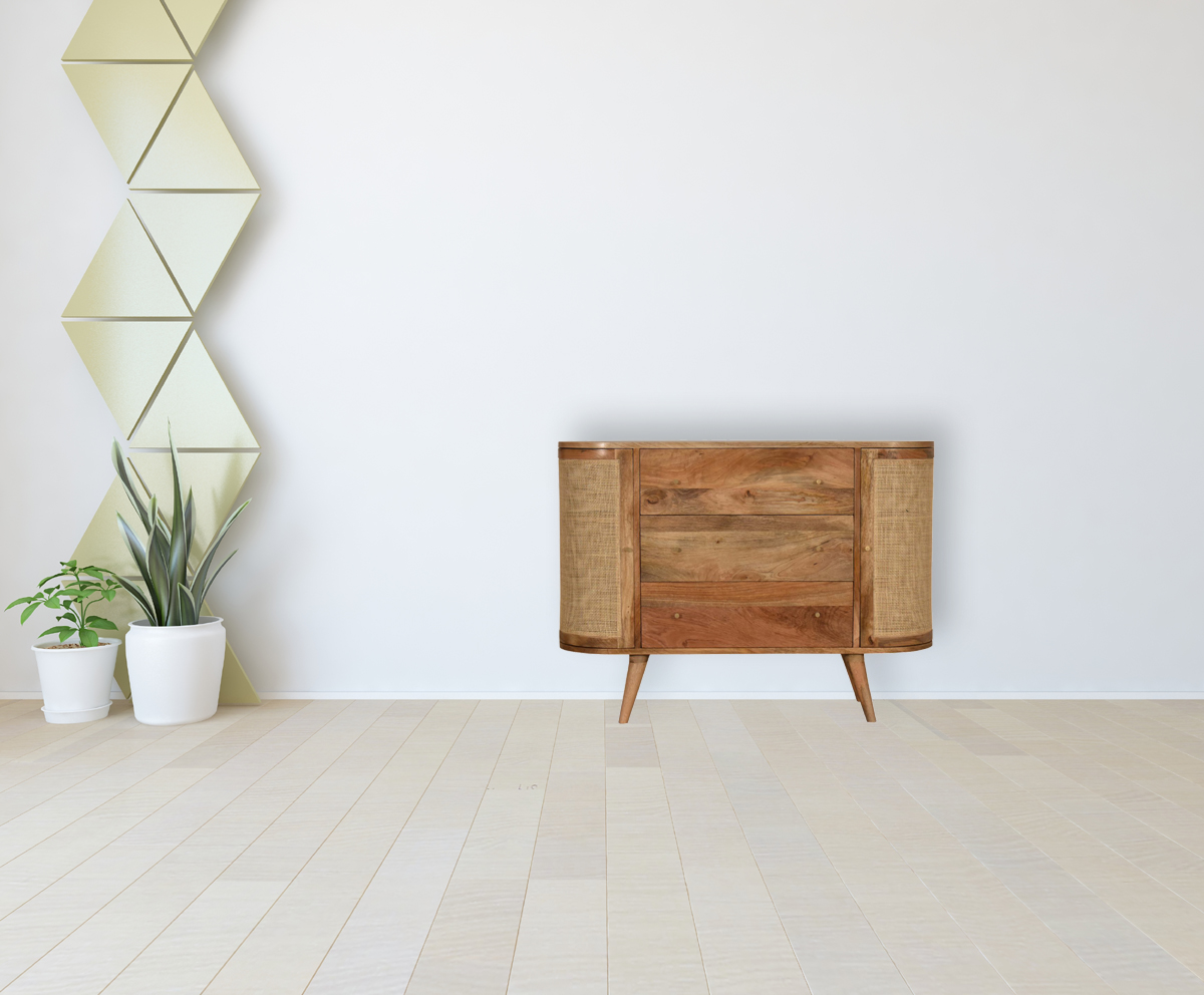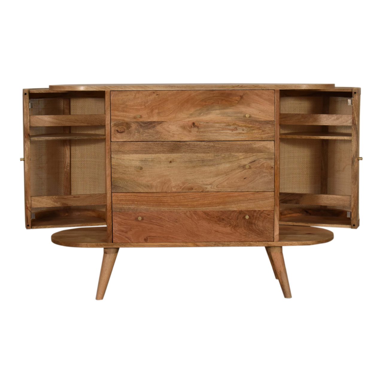 This stylish cabinet combines 2 woven-style door fronts with a smooth oak-ish finish body and legs. Constructed from 100% solid mango legs it features 3 spacious drawers perfect for storage, shiny knobs on the drawers, and nordic style legs. Make full use of this cabinet in the living room or bedroom and partner it with the rest of the collection.