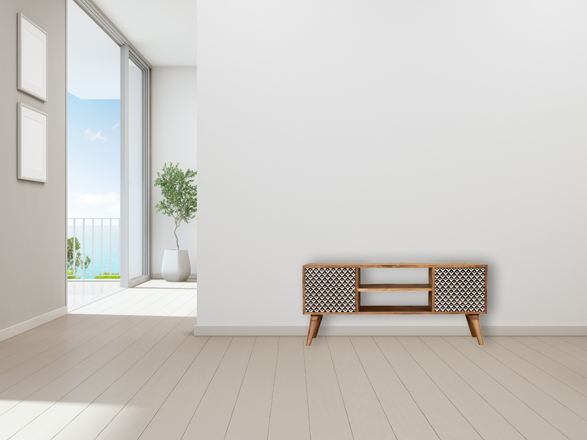 This media unit has been constructed from 100% solid mango wood in a fine oak-ish finish. The 2 doors feature a black and white screen printed pattern which is bound to uplift your living room and allow you to store any bits and pieces discreetly. It also has 4 Nordic style legs, 2 open slots and ample space on top for a TV.