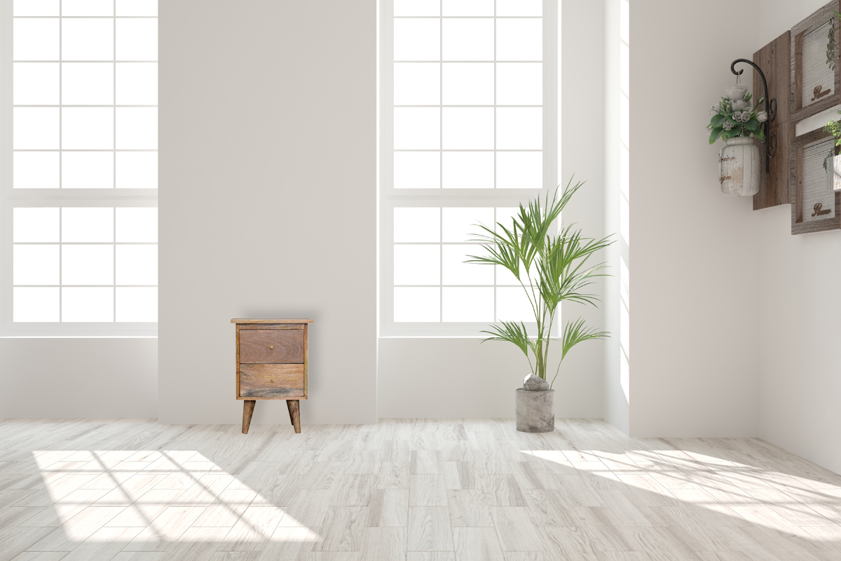 This bedside table has been constructed from 100% solid mango wood with Nordic style legs in a oak-ish finish and features shiny knobs on the 2 drawers for easy access. An easy, simple, and versatile piece to add to any type of bedroom.