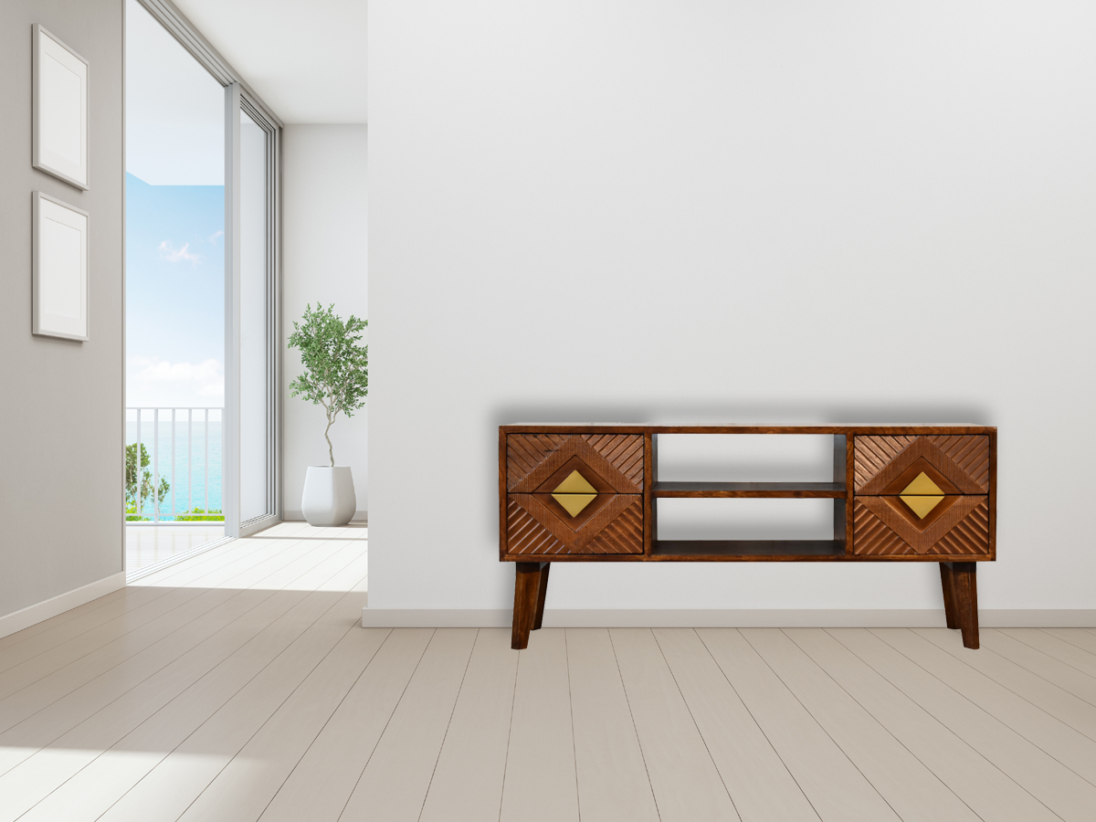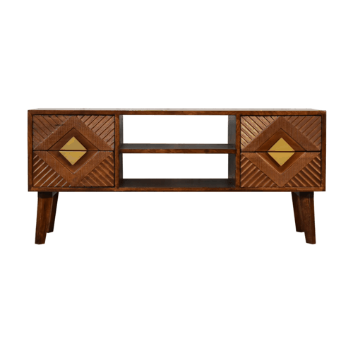 This striking Alma Media Unit has been made from 100% solid mango wood in a chestnut finish and offers a striking ridged design surrounded by a brass inlay diamond. Other features include 2 large open slots and nordic style legs. Place a TV, a turntable or a favorite art piece on top and enjoy your new, contemporary living room.