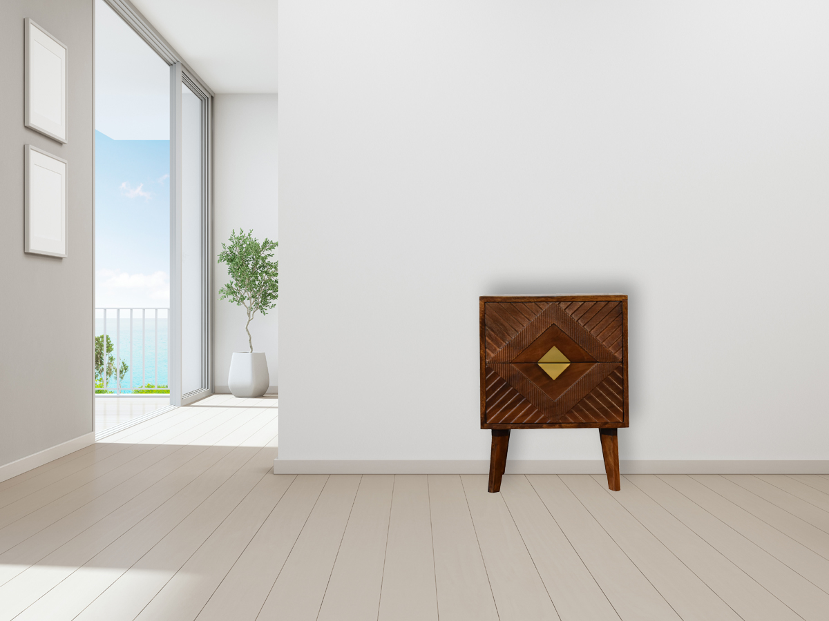 This striking Alma Bedside has been made from 100% solid mango wood in a chestnut finish and offers a striking ridged design surrounded by a brass inlay diamond. Other features include 2 large open slots and nordic style legs. Place a plant, a photo frame or a lamp piece on top and enjoy your new, contemporary bedroom.