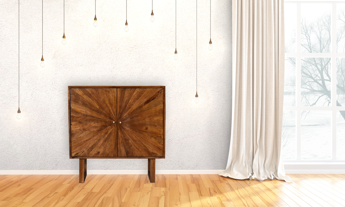 This cabinet has been designed to provide convenient storage space for your home. It has been constructed from 100% solid mango wood in a chestnut finish with a sunrise pattern followed by shiny candle knobs. Offering a modern retro aesthetic, this cabinet is both a handy and timeless option for your home.